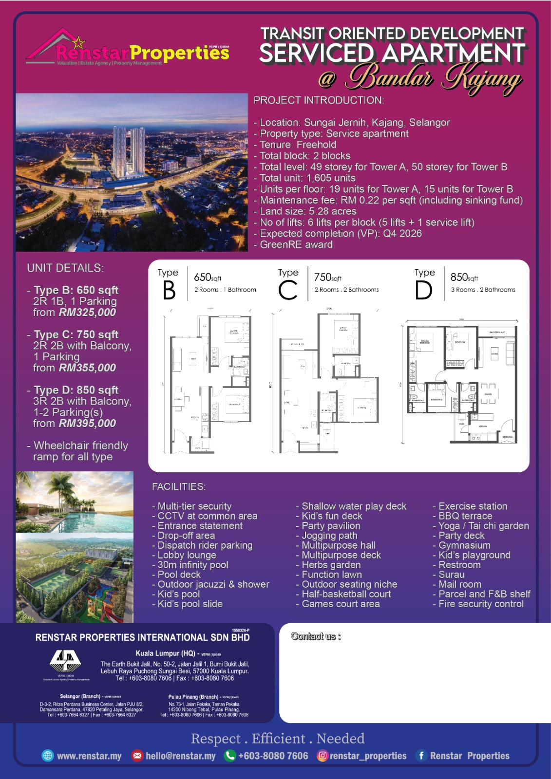 - Type B: 650 sqft (2 bedrooms, 1 bathroom, 1 parking)
